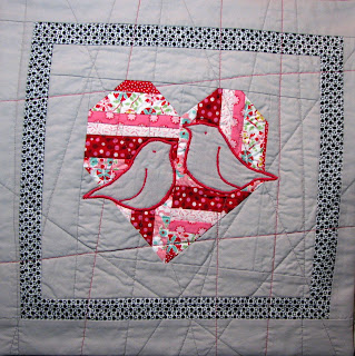 Mary sent me this beautiful pillow cover for our Valentin Swap. It is absolutely lovely--pieced border, raw-edged applique and a blue bird! It will look great on my cranberry couch, but I think first I will hang it in my office so I can share it with more people (and keep it cat hair free).
